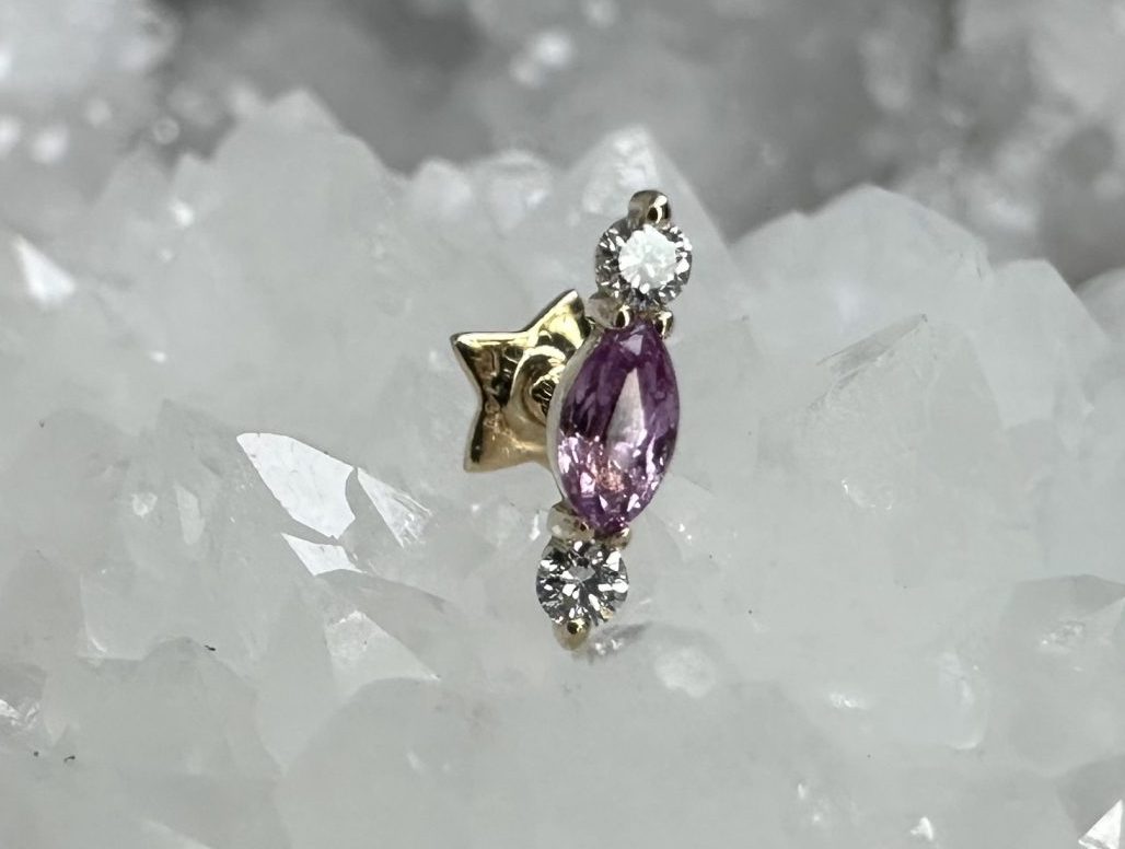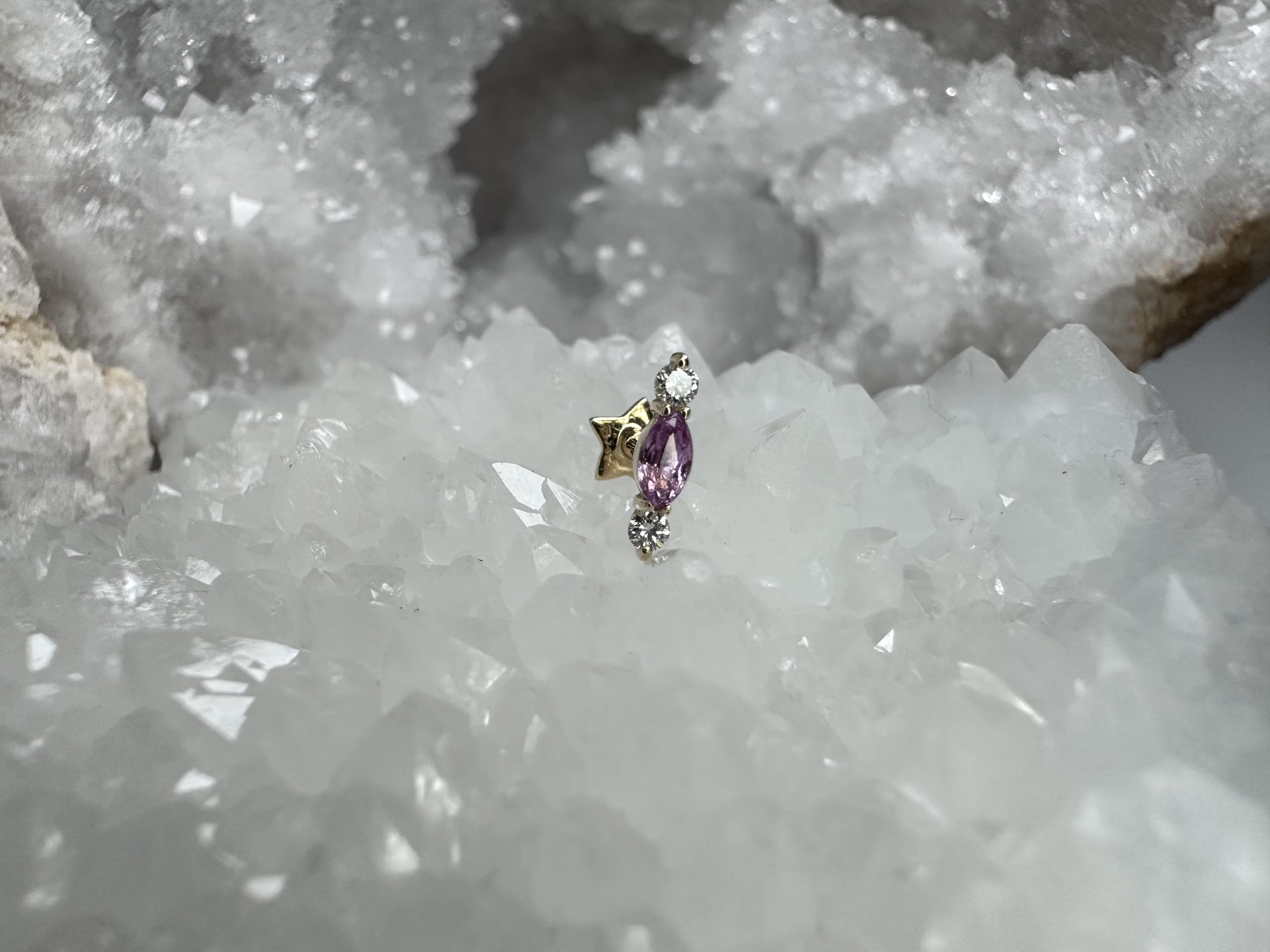 Tête de piercing pour stud (labret) en or 18 carats sertie d’une marquise en saphir rose naturel et de diamants créés en laboratoire associe une fabrication soignée en or 18 carats à une finition polie pour un confort optimal. La pierre mise en valeur : diamants créés en laboratoire. Compatible avec de nombreuses zones : lobe, tragus, hélix, flat, conch, faux rook, médusa, nostril. Chaque tête est **livrée avec un labret en titane ASTM F136** (standard médical). Possibilité de commander séparément un labret en or 18 carats pour un bijou 100 % or.